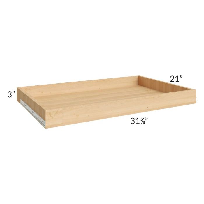 Roll out tray for any 24" deep by 36" wide cabinet. The drawer glides and wood finish for the roll out tray will be the same as the standard drawers for this collection. **Please note, if using with a partial overlay collection (Tribeca Shaker or Glazed Praline), order according to the width of a cabinet, for example, the 15" roll out tray fits a 15" wide base cabinet. For full overlay collections, order according to the width of the cabinet if the roll out is NOT being installed between the hinges. If it will be installed between hinges, order 1 size smaller (for example use the 15" roll out for an 18" wide base cabinet) and use included shims for installation so the tray clears the hinges when opening**