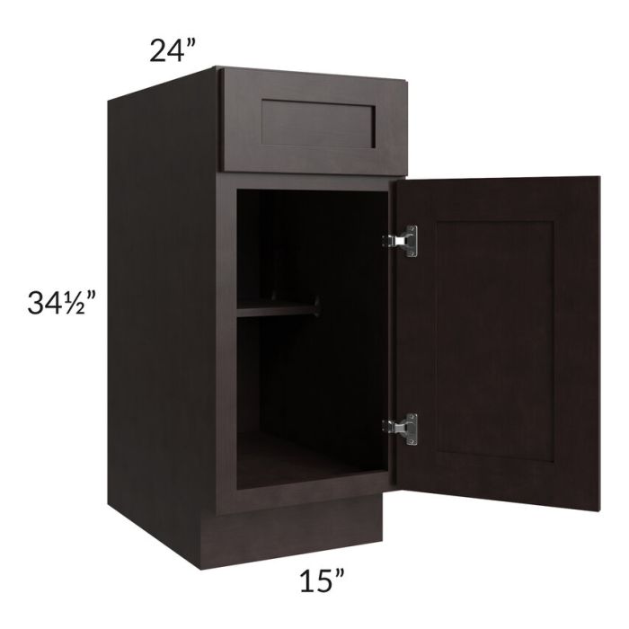 1 door base cabinet with 1 drawer and 1 shelf. Looking for a trash pullout for this cabinet? Find one here: https://www.thertastore.com/countertops-and-accessories/inside-cabinet-accessories/bottom-mount-single-pullout-waste-container-fits-an-15-wide-base-cabinet.html.