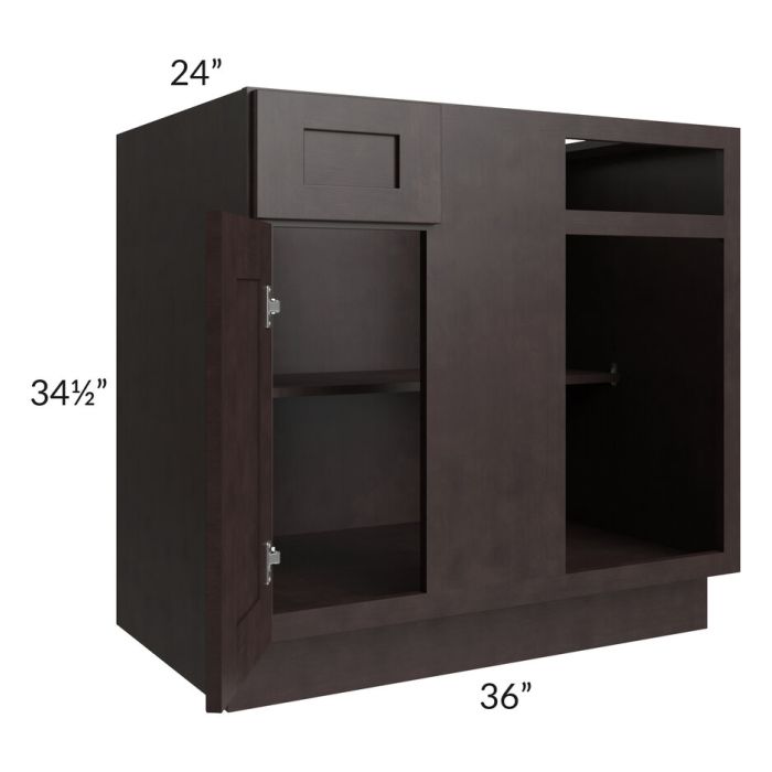 1 door blind base corner cabinet. The actual width is 36" however it will take up a minimum of 39" of wall space and can be pulled up to 42". This cabinet has 1 drawer and is reversible. The door/drawer width is 11-9/16”, blind opening is 8 7/8”. The drawer and door opening will be 3" less than the width of the door and drawer front. A filler will be needed between the blind and adjacent cabinet to ensure the drawer and door open properly; the filler must be purchased separately.