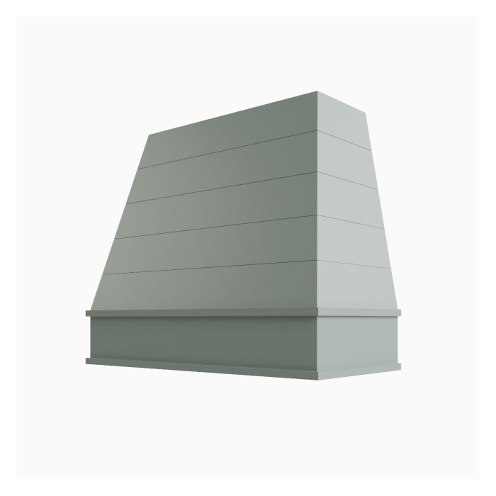 Shiplap style, tapered hood with block molding. Features a plywood and Maple construction. The hood base front panel is 30" but at the widest point with the molding, the total width is 31-1/2". The side panel is 19-1/2" deep, and 20-1/4" deep with the molding. The top of the chimney is 26" wide and 14-1/2" deep and the chimney section is trimmable by 6" to make the total height 42", if needed. The height of the panel and molding section on bottom is 8-1/4". The hood has a two-piece construction for easy mounting and access to fan and ducting. Ships assembled.