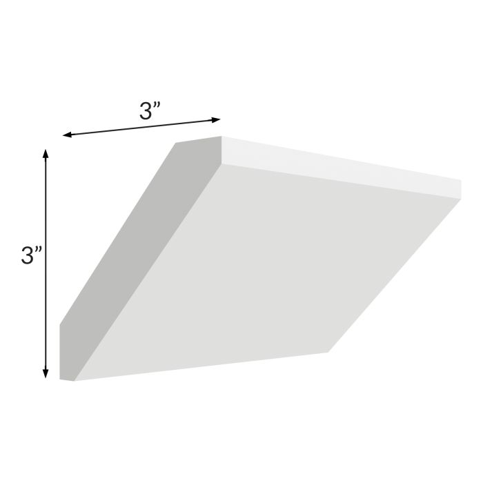 Large angled crown molding that is approximately 3/4" thick. Once installed, the molding will stick out from the cabinet about 3", and will be about 3" high.