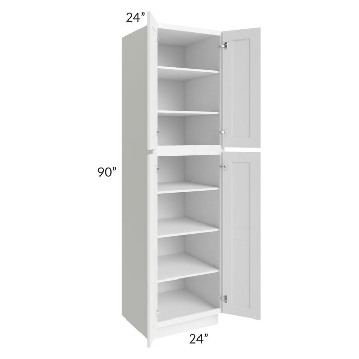 Wall pantry cabinet that has 4 doors, 2 smaller doors on top and 2 larger doors on bottom. This pantry cabinet comes with 1 fixed shelf and 5 adjustable shelves. There is no center stile. Measurements are as follows: Top/Middle/Bottom door width is 11-11/16". Top door height is 35-5/16". Middle/Bottom door height is 49-1/4".