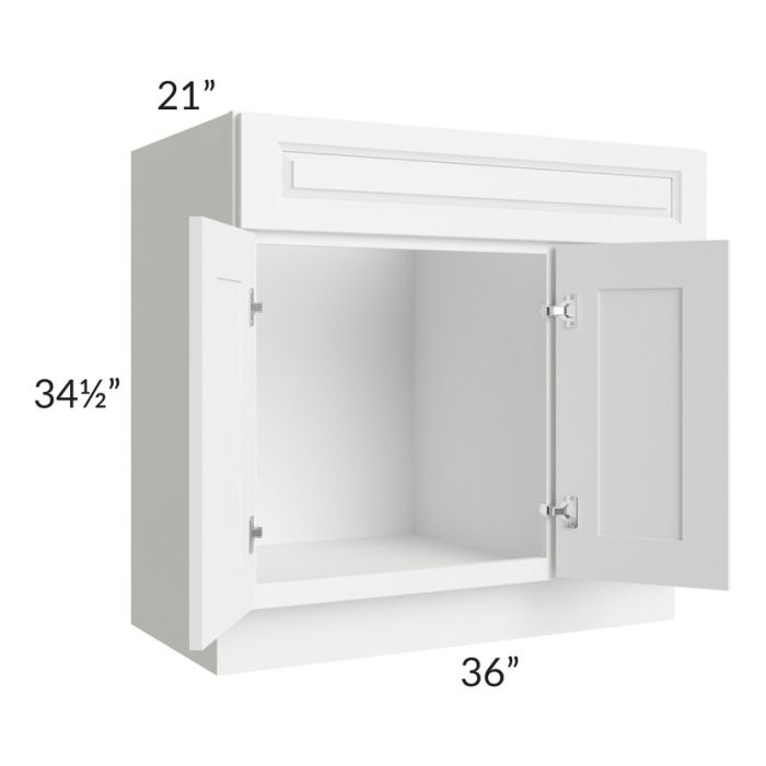 Bathroom vanity that has 2 doors on the left, 1 fake drawer front on top, and 2 drawers on the right.