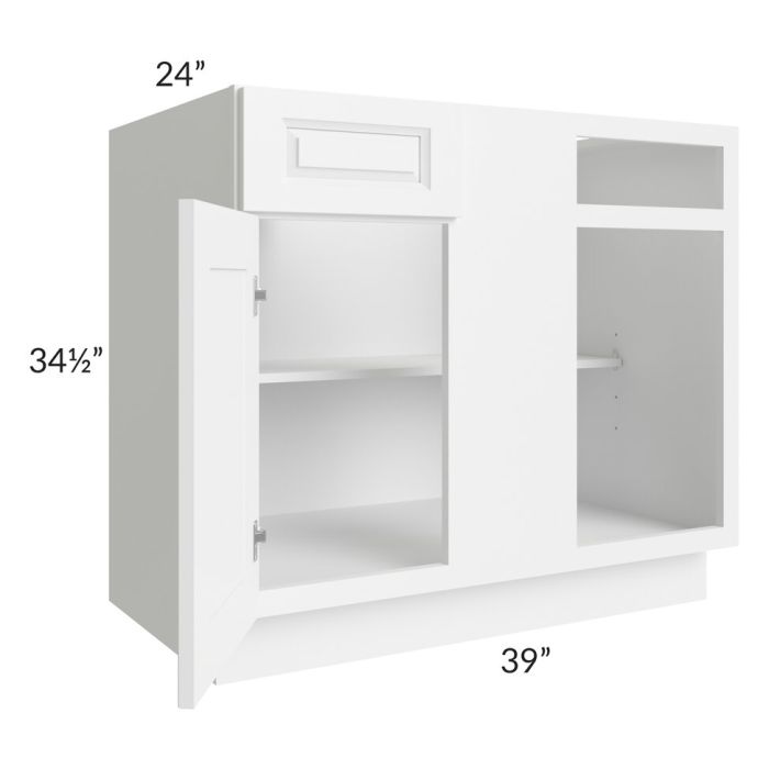 1 door blind base corner cabinet. The actual width is 39" however it will take up a minimum of 42" of wall space and can be pulled up to 45". This cabinet has 1 drawer and is reversible. The door/drawer width is 14-9/16”, blind opening is 11 7/8”. The drawer and door opening will be 3" less than the width of the door and drawer front. A filler will be needed between the blind and adjacent cabinet to ensure the drawer and door open properly; the filler must be purchased separately.