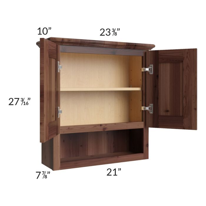 Bathroom wall cabinet with 2 doors on top and an open shelf area on bottom. The overall depth is 7-7/8" and innterior depth is 6-1/2". The width including the molding is 23-3/8".