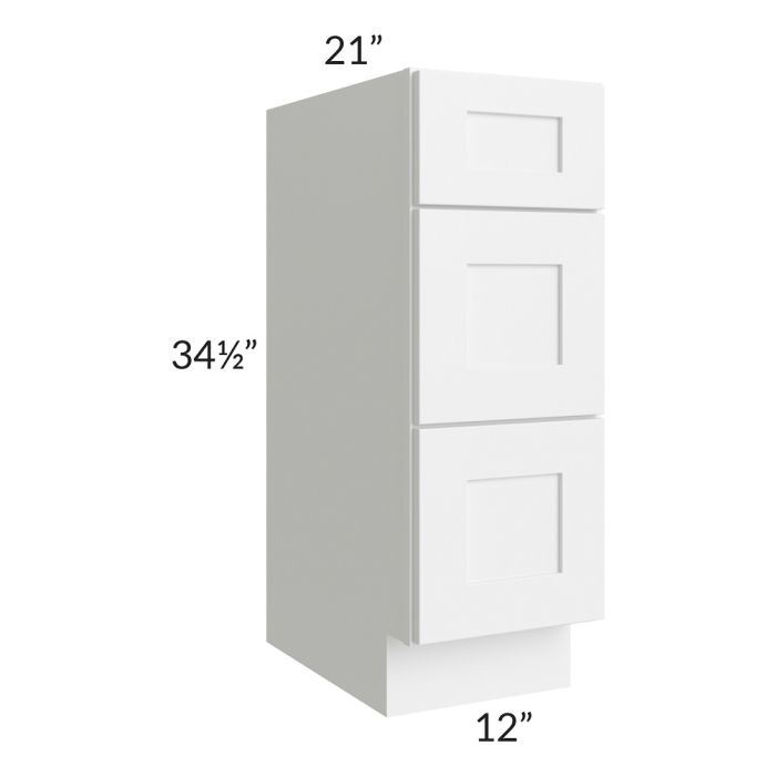 Description / Frosted White Shaker 12" Vanity Three Drawer Base Cabinet - Out of stock through April