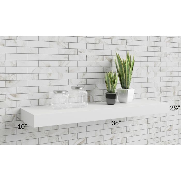 Floating shelf that must be installed between two cabinets, or between one cabinet and a wall. The shelf will be finished to match on the front, sides, top and bottom. The maximum load is 15 lbs per linear foot. *Please note that the floating shelves are not trimmable.*