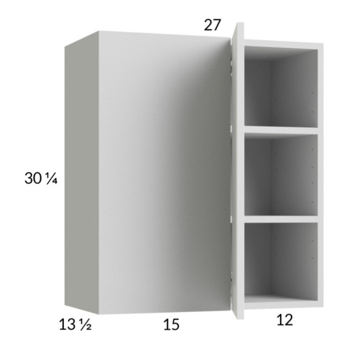 Blind corner wall cabinet that takes up a minimum of 27" of wall space and can be pulled up to 30". The actual cabinet width is 27", it can be installed right against the corner if needed, or pulled a maximum of 3" from the corner. This cabinet is reversible. The door width is 12" and the blind section width is 15". A filler must be installed between the blind cabinet and the adjacent wall cabinet (so it's perpendicular to the blind cabinet).