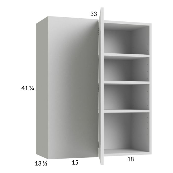 Blind corner wall cabinet that takes up a minimum of 33" of wall space and can be pulled up to 36". The actual cabinet width is 33", it can be installed right against the corner if needed, or pulled a maximum of 3" from the corner. This cabinet is reversible. The door width is 18" and the blind section width is 15". A filler must be installed between the blind cabinet and the adjacent wall cabinet (so it's perpendicular to the blind cabinet).