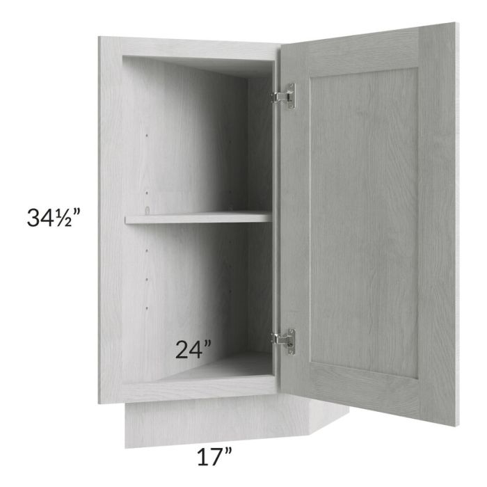 Full height door cabinet that is meant to be used at the end of a cabinet run. It will have a 24" deep side on the left which gets installed against the adjacent cabinet. The door is angled and the exposed side of the cabinet (on the right) will be 12" deep.