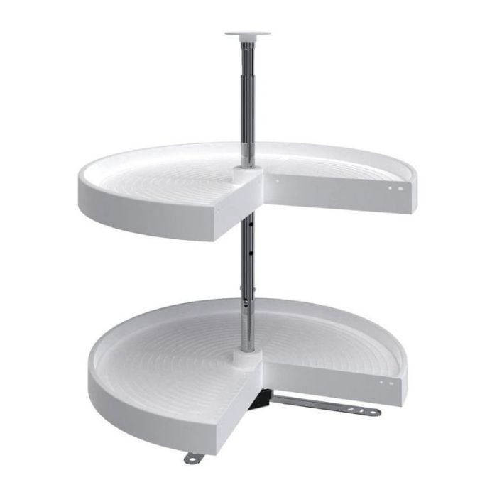 Set of 2 lazy susan white plastic polymer trays with center mounting pole and hardware. Please note that 2 metal baskets trays (which can be changed to this plastic polymer option when ordering the cabinet) already come standard when ordering a lazy susan corner cabinet (LS3312 or LS3612). Only order these if more parts are needed, for example: for replacement or custom applications.