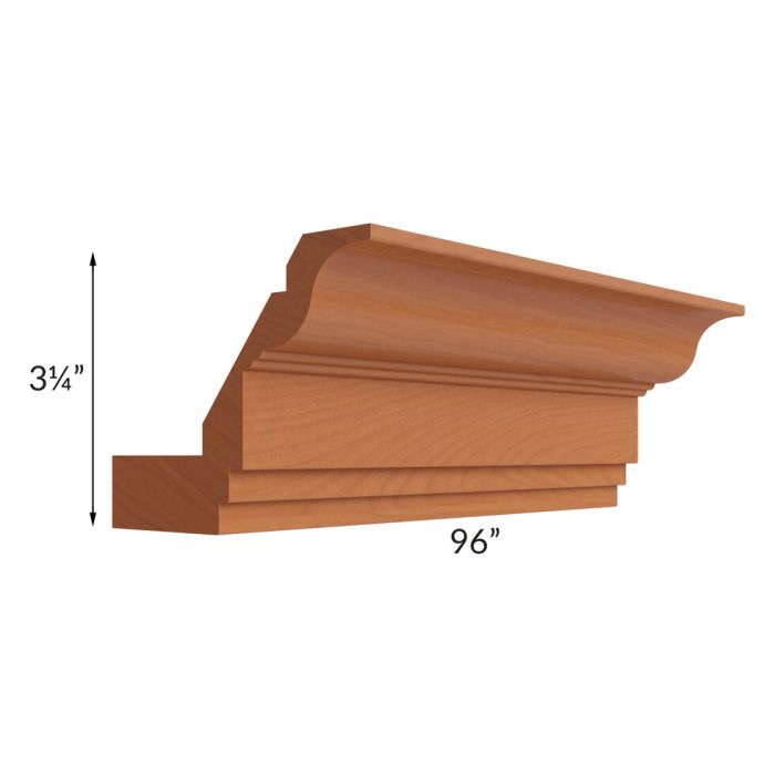 Classic crown molding that will be 3-1/4" high once installed. Can be used with the DMI8 Dentil Molding or RMI8 Rope Molding inserts. Crown will have a 'heel' attached to the base to attach to the top of wall cabinets. If installing crown directly to the wall or the ceiling, the Classic Crown Molding (CM8) will work better since it does not have the 'heel'.