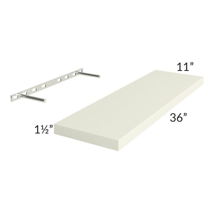 Floating shelf that will also include the mounting hardware. Once mounted, the shelf will be able to move or 'float' to the left and right. Each shelf can hold up to 25lbs. It can be trimmed up to 1/2” on each side but then will have a raw exposed edge so should be placed adjacent to a cabinet, panel, wall, etc...or the raw edge will have to be finished.