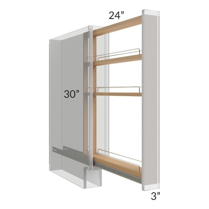 Spice pull out to be used with a 3x30 filler (sold separately - see SKU WF330). It comes with chrome rails and full extension, ball bearing glides (not soft-close). It will have 3 adjustable shelves and is constructed of UV coated maple wood. The pullout must be installed between 2 cabinets and the 3" filler (SKU WF330) must be ordered separately. An additional overlay or decorative filler can be installed on the 3" filler if desired (also sold separately).