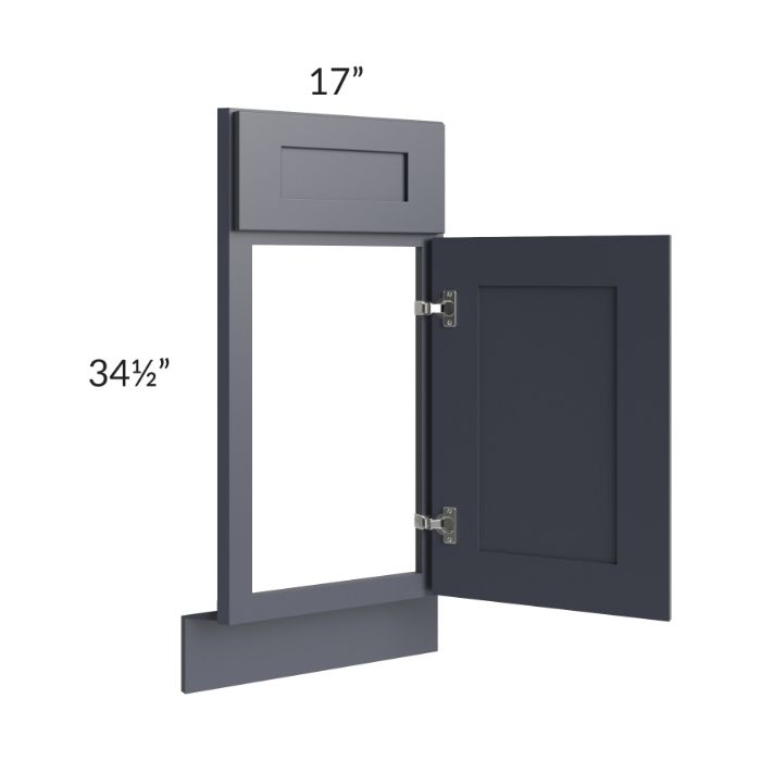 Diagonal corner sink front that will take up 36" of wall space from the corner out, on each wall, once installed. The door width is 14-1/2" and the face frame width is 17". This cabinet will have a partial overlay door to ensure it opens without hitting the adjacent cabinet, so there will be about 1-1/8" of face frame, visible on either side of the door. The corner sink front floor must be ordered separately (SKU DSFL36).