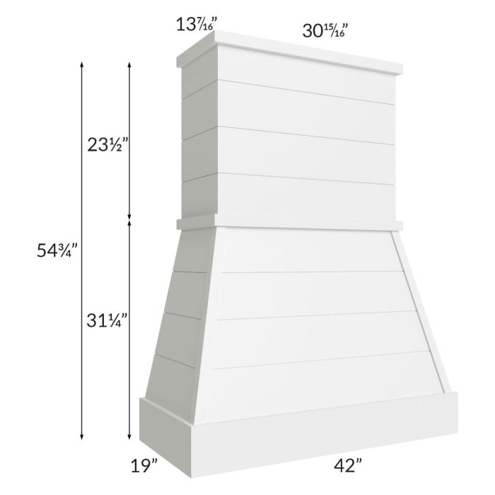 Farmhouse style wood hood that comes with a stainless steel liner. The chimney height of 23-1/2" can be trimmed on site, if needed. Blower is not included and would need to be purchased separately. The chimney depth is 13-7/16" and the width is 30-15/16".