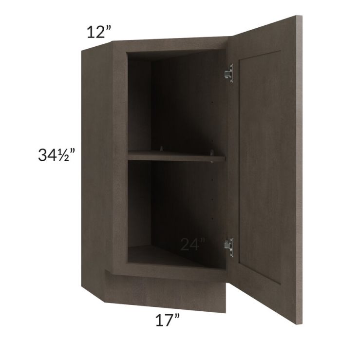 Full height door cabinet that is meant to be used at the end of a cabinet run. It will have a 24" deep side on the right which gets installed against the adjacent cabinet. The door is angled and the exposed side of the cabinet (on the left) will be 12" deep.