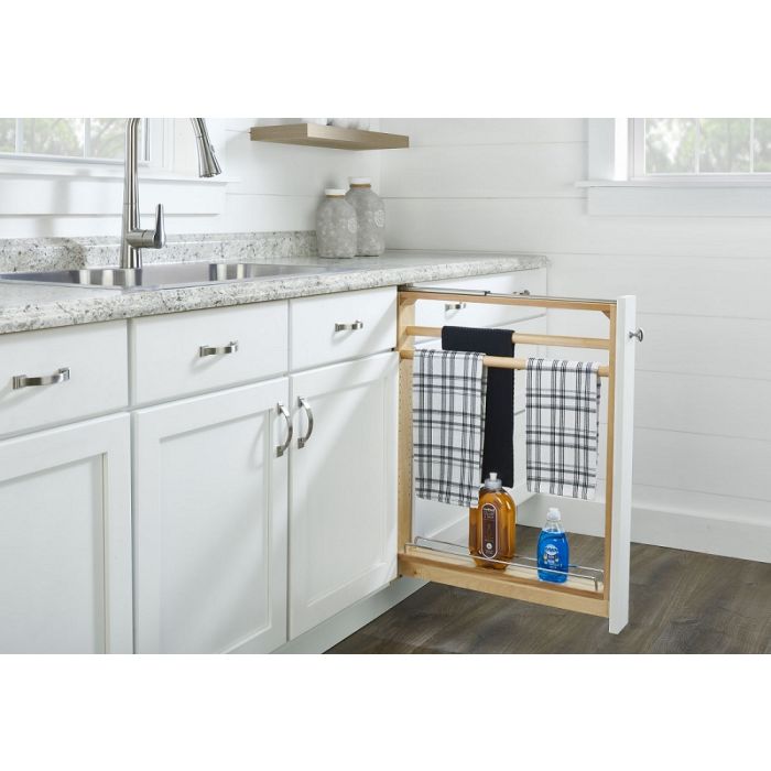 Looking for a better way to store hand towels and cleaning supplies in the kitchen? Look no further than the new Filler Organizer, featuring natural maple construction, full-extension, ball-bearing slides with soft-close, two towel bars and a static shelf with chrome wire accents. Filler matching the cabinets needs to be ordered separately.