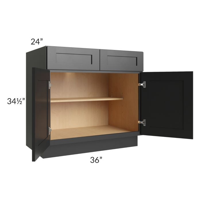 2 door base cabinet that has a half depth adjustable shelf and 2 drawers.