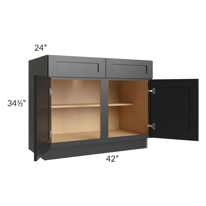 2 door base cabinet that has 1 half depth adjustable shelf and 2 drawers. This cabinet does have a center stile and will not have butt doors.
