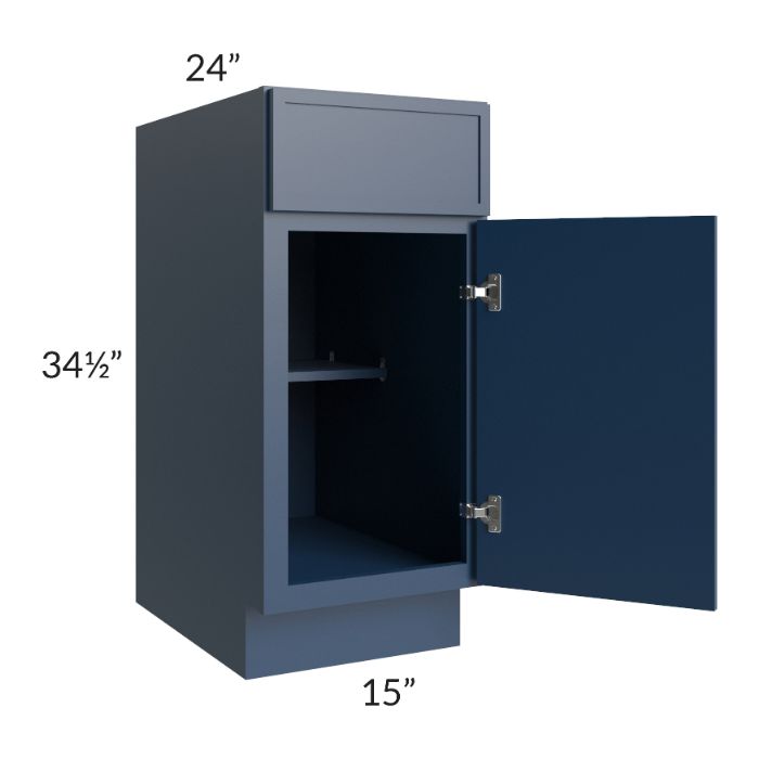 1 door base cabinet with 1 drawer and 1 shelf. Looking for a trash pullout for this cabinet? Find one here: https://www.thertastore.com/countertops-and-accessories/inside-cabinet-accessories/bottom-mount-single-pullout-waste-container-fits-an-15-wide-base-cabinet.html.