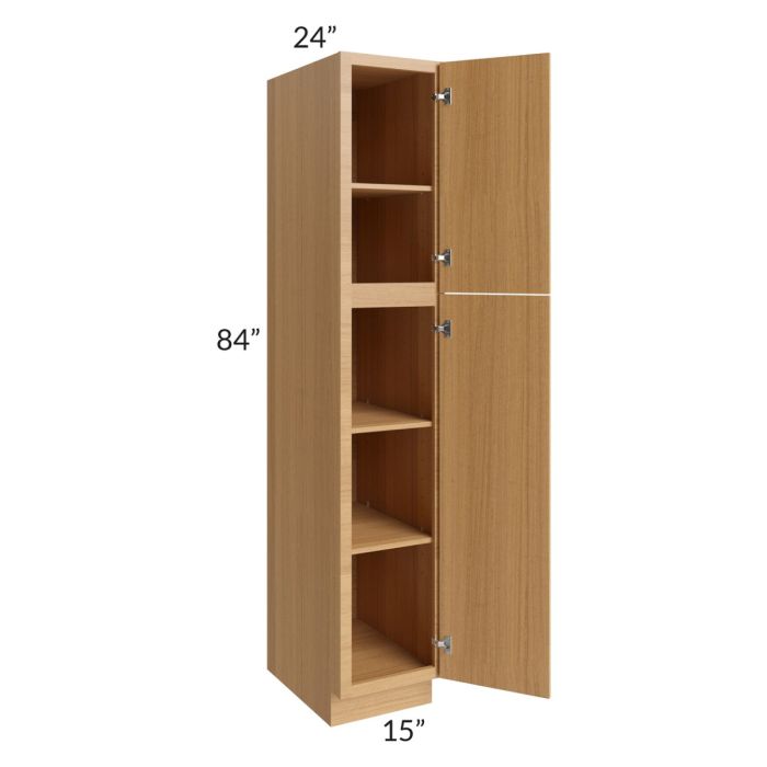 Wall pantry cabinet with 2 doors, 1 smaller door on top and 1 larger door on bottom. This pantry cabinet comes with 1 fixed shelf and 3 adjustable shelves. Measurements are as follows: Top/Middle/Bottom door width is 14-1/2". Top door height is 29-5/16". Middle/Bottom door height is 49-1/4".