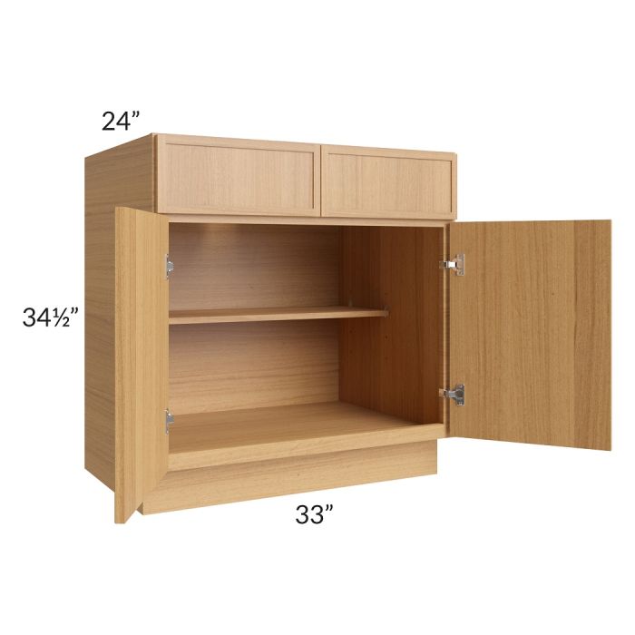 2 door base cabinet with 2 drawer and 1 shelf. There is no center stile on this cabinet.