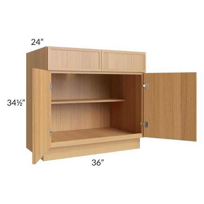2 door base cabinet with 2 drawer and 1 shelf. There is no center stile on this cabinet.