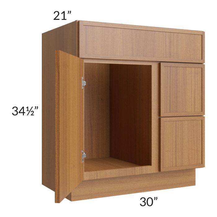 Bathroom vanity that has 1 door on the left, 1 fake drawer front on top, and 2 drawers on the right.