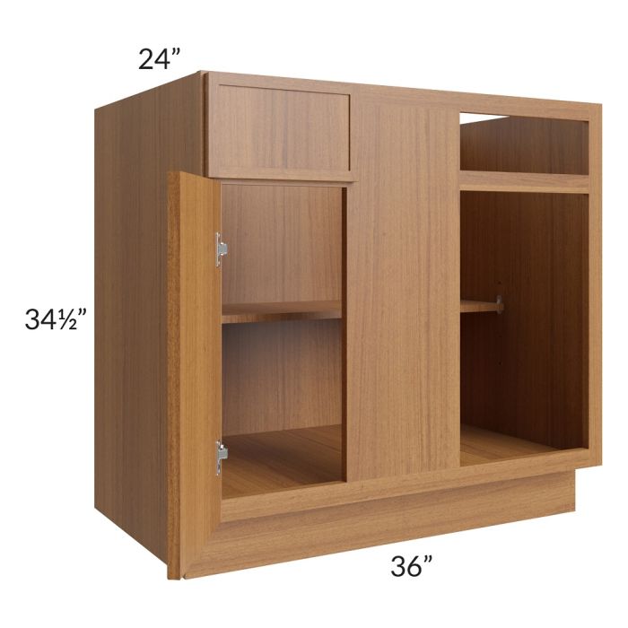 1 door blind base corner cabinet. The actual width is 36" however it will take up a minimum of 39" of wall space and can be pulled up to 42". This cabinet has 1 drawer and is reversible. The door/drawer width is 11-9/16, blind opening is 8-7/8. The drawer and door opening will be 3" less than the width of the door and drawer front. A filler will be needed between the blind and adjacent cabinet to ensure the drawer and door open properly; the filler must be purchased separately.