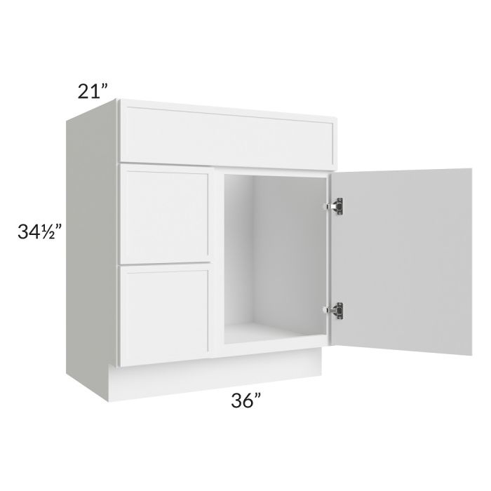 Bathroom vanity that has 1 door on the right, 1 fake drawer front on top, and 2 drawers on the left.