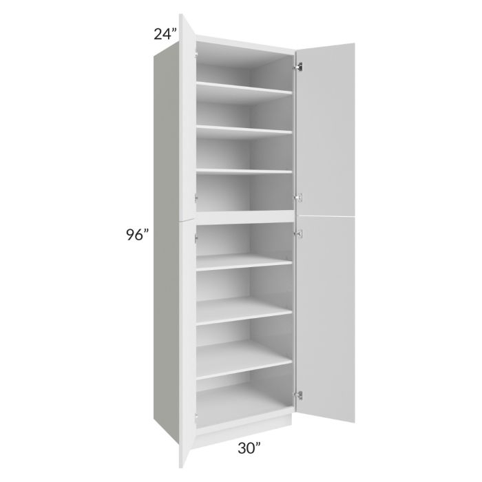 Wall pantry cabinet that has 4 doors, 2 smaller doors on top and 2 larger doors on bottom. This pantry cabinet comes with 1 fixed shelf and 5 adjustable shelves. There is no center stile. Measurements are as follows: Top/Middle/Bottom door width is 11-11/16". Top door height is 41-5/16". Middle/Bottom door height is 49-1/4".