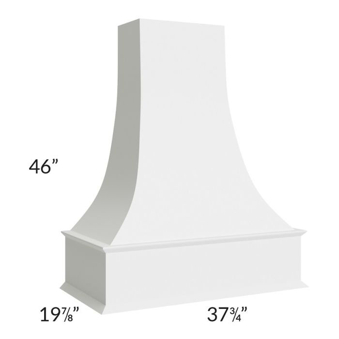 Curved wood hood that can be trimmed on top, if needed. Measurements without moldings are 36"W x 19"D. The bottom apron measures 8"H and the total hood height is 46'". The top of the hood is 17"W x 9-1/2"D.