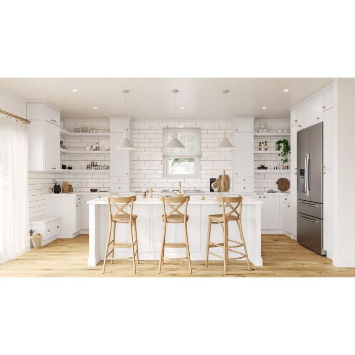| Installation/Design Note: | The full-overlay door style leaves roughly a 1/4" clearance on the edge. If installed directly against a wall or deeper cabinet and a cabinet door opening of at least 90 degrees is desired, scribe molding should be installed between the cabinet and the wall (or deeper cabinet). If not, the door may not be able to open a full 90 degrees. For a full opening, a space of at least 1/4-1/2" is necessary, a larger space may be needed depending on the decorative hardware used on the cabinets. |