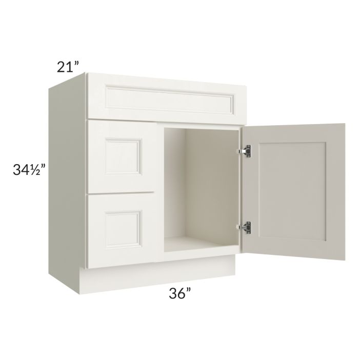 Bathroom vanity that has 1 door on the right, 1 fake drawer front on top, and 2 drawers on the left.