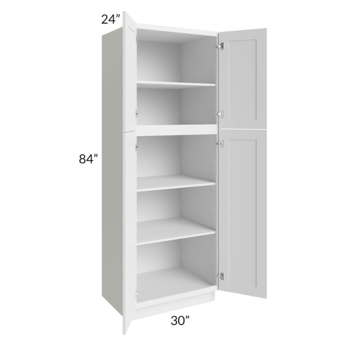 Wall pantry cabinet that has 4 doors, 2 smaller doors on top and 2 larger doors on bottom. This pantry cabinet comes with 1 fixed shelf and 3 adjustable shelves. There is no center stile. Measurements are as follows: Top/Middle/Bottom door width is 11-11/16". Top door height is 29-5/16". Middle/Bottom door height is 49-1/4".