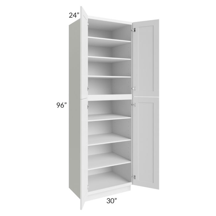 Wall pantry cabinet that has 4 doors, 2 smaller doors on top and 2 larger doors on bottom. This pantry cabinet comes with 1 fixed shelf and 5 adjustable shelves. There is no center stile. Measurements are as follows: Top/Middle/Bottom door width is 11-11/16". Top door height is 41-5/16". Middle/Bottom door height is 49-1/4".