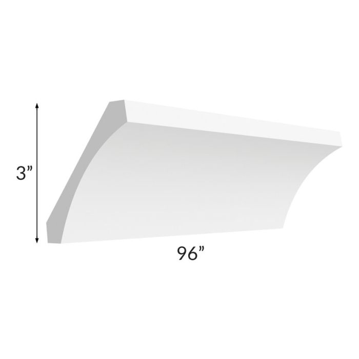 Crown molding with large cove detail. Installed height will be 3" and installed depth will be 2-3/4" (how far it will extend from the cabinet).