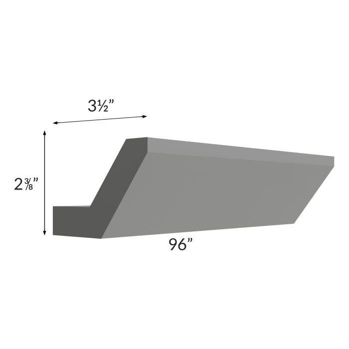 Shaker crown molding. Installed height will be 2-3/8" and installed depth will be 3-1/2" (how far out it will extend from the cabinet).