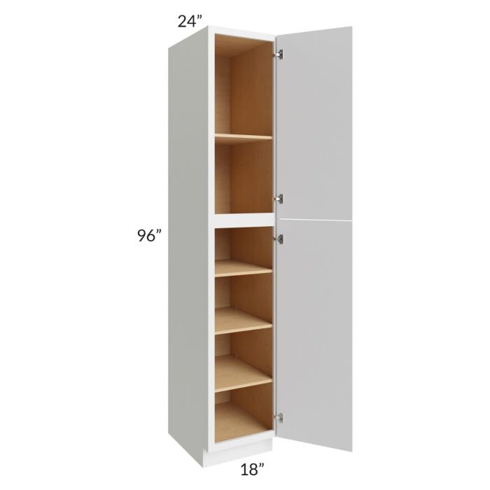 Wall pantry cabinet that has 2 doors (smaller door on top and larger door on bottom) and 4 adjustable shelves.