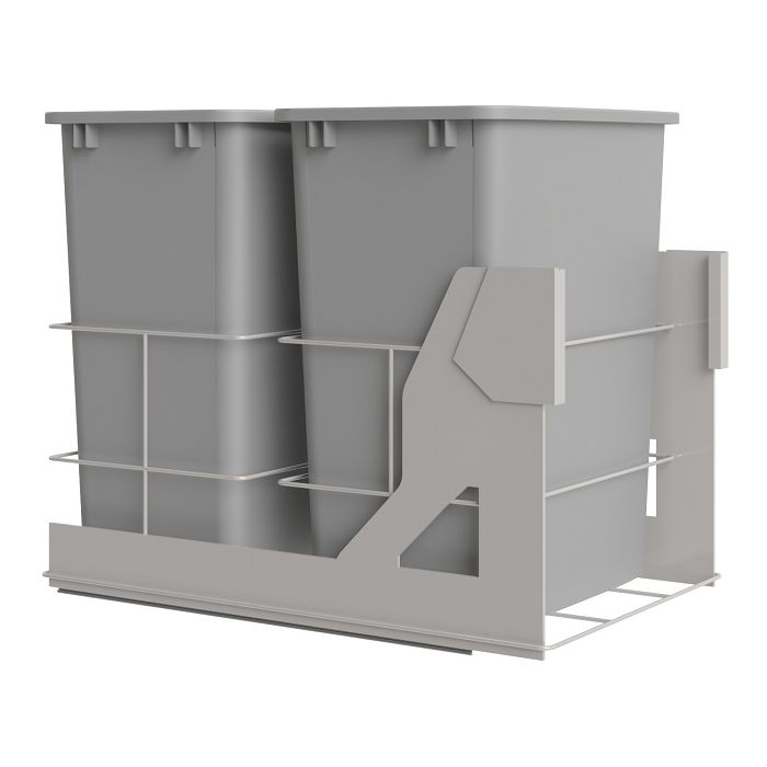 Metal trash can insert with soft close glides to be used with an 18" full height door base cabinet. Comes with 2 trash bins.