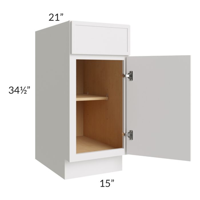 Vanity base cabinet with (1) door, (1) drawer, and (1) 15" deep shelf. There will be a 2" clearance between the drawer and back panel. The drawer front is 6-3/4" high.